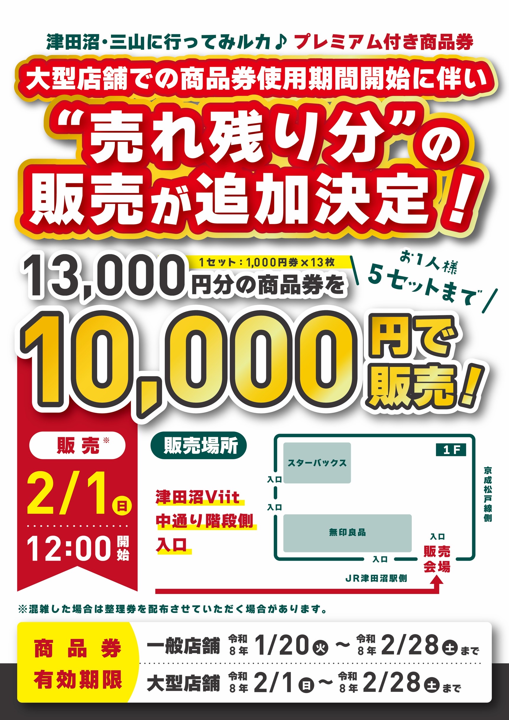プレミアム付き商品券の”売れ残り分”の販売が追加決定しました 2026.01.26 プレミアム付き商品券の”売れ残り分”の販売が追加決定しました 2月1日 日曜日 12時より 津田沼Viit1階 中通り階段側入口にて販売開始です お一人様5セットまでとなります 是非ご利用下さい Tweet Share Hatena Pin it 「津田沼・三山に行ってみルカ♪」プレミアム商品券を三...